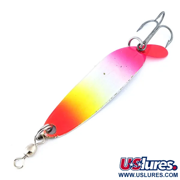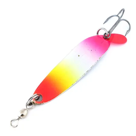 Mesurant 5,5 cm (2 1/4") pour un poids de 10 g (1/3 oz), cette cuillère ondulante est conçue pour atteindre des zones éloignées avec précision. La Luhr Jensen Krocodile se caractérise par son profil étroit et son épaisseur importante, ce qui lui permet de fendre le vent plus efficacement que des modèles plus larges et plus fins. Portant le code produit 10711, cet exemplaire présente un dégradé saisissant allant du rose au niveau de l'hameçon au rouge-orangé sur le nez, en passant par le blanc et le jaune. Ses propriétés réactives aux UV sont exceptionnelles ; en condition de faible luminosité, le centre du corps émet une forte lueur verte tandis que les extrémités virent au cramoisi profond. L'armement comprend un émerillon baril à l'avant pour protéger la ligne et un hameçon triple piquant orné d'un teaser en plastique rouge. Le leurre est dans un état 5/5, conservant son éclat d'usine sur ses surfaces réfléchissantes. Qu'elle soit traînée ou lancée, la répartition des masses de ce design produit une nage oscillante constante, redoutable pour le saumon ou la truite.