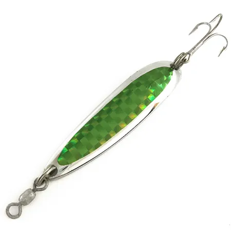 D'une longueur de 2 1/2" (6,5 cm), ce classique de Luhr Jensen est un incontournable pour les pêcheurs ciblant les gros spécimens en eau profonde. La finition en nickel poli de cette cuillère ondulante de 1/2 oz (14 g) est accentuée par un ruban prismatique holographique vert éclatant qui couvre la majeure partie de la face convexe. L'estampille « Krocodile » ainsi que son origine Hood River, OR, USA, sont clairement marquées sur l'intérieur concave. Elle est équipée d'un hameçon triple renforcé attaché via un anneau brisé robuste, et d'un émerillon baril sur l'extrémité avant pour minimiser le vrillage de la ligne lors du lancer ou de la traîne. Ce spécimen spécifique, identifié par le code produit 6490, est à l'état neuf, obtenant une note de 5/5 pour ses surfaces impeccables et son armement piquant. Luhr Jensen a conçu ce modèle Die #4 avec un profil plus épais et plus étroit que les cuillères traditionnelles, afin de faciliter les lancers à longue distance depuis les jetées ou les bateaux. Les propriétés réfléchissantes du motif prisme vert sont particulièrement adaptées aux conditions de luminosité variables rencontrées lors de la traque du saumon ou de la truite.