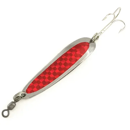 Un ruban prismatique rouge en damier crée un éclat très visible sur la finition nickel poli de cette cuillère ondulante fabriquée aux USA. Pesant 17g (3/5oz), cette Krocodile Die #4 est conçue pour la polyvalence, mesurant 6,5 cm (2 1/2") de long. Luhr Jensen a conçu ce leurre avec un profil épais et étroit spécifiquement pour faciliter les lancers à longue distance et atteindre les eaux profondes, ce qui en fait un incontournable pour les pêcheurs de saumon des Grands Lacs et les pêcheurs de jetée. Au revers, le métal est clairement estampillé du marquage KROCODILE, reflétant la construction solide attendue par les collectionneurs de matériel américain vintage. L'armement reste robuste, comprenant un émerillon monté en usine pour minimiser le vrillage de la ligne et un hameçon triple piquant sécurisé par un anneau brisé renforcé. Identifié par le code 6554, ce spécimen est en excellent état, noté 5/5. Que vous pêchiez du bord ou à la traîne, sa conception est prévue pour maintenir une nage oscillante constante à différentes vitesses de récupération. Cette combinaison spécifique nickel et rouge est un choix classique pour imiter un poisson fourrage blessé en eau douce comme en mer.