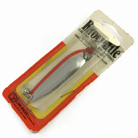 Un nickelage sur une structure de 14 g (1/2 oz) définit l'essence de ce classique Luhr Jensen. Mesurant 6,5 cm (2 1/2"), le Krocodile Die #4 UV présente un corps estampé épais conçu pour maintenir son profil lors des présentations en eaux profondes. Alors que la bande rouge apparaît comme un accent standard à la lumière du jour, elle réagit avec un éclat orange-rouge distinct sous la lumière UV, un détail technique destiné à rester visible lorsque le spectre lumineux s'estompe en profondeur. Ce spécimen spécifique, identifié par le code produit 6195, reste dans son emballage d'usine original de Hood River, Oregon. La cuiller est inutilisée et livrée montée avec ses anneaux brisés robustes et son hameçon triple d'origine. Fabriqué aux USA, ce leurre a été conçu pour des applications polyvalentes, notamment le lancer, la traîne et le jigging, ciblant spécifiquement le saumon et d'autres prédateurs puissants. Le support en carton témoigne de l'héritage de Luhr Jensen & Sons, Inc., préservant l'appât dans son état de vente au détail d'origine.