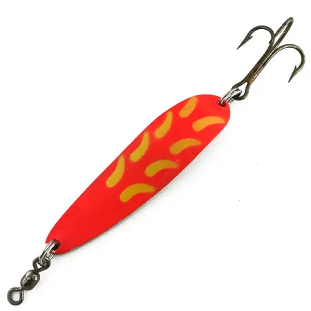 Mesurant 6,5 cm (2 1/2"), cette cuillère ondulante est un modèle classique en métal dense issu de la lignée renommée de Luhr Jensen. Son poids de 14 g (1/2 oz) lui confère une densité élevée par rapport à sa surface, une caractéristique de la série Krocodile, lui permettant d'atteindre rapidement les zones profondes où se postent souvent les saumons et les truites. Son profil visuel se définit par une face supérieure orange-rouge néon vive, décorée d'accents jaunes en forme de croissant, et un dessous en laiton poli. Dans des conditions de faible luminosité, le modèle 9080 révèle ses propriétés réactives aux UV, comme illustré sur la seconde image, offrant une visibilité accrue en eaux troubles ou à l'aube et au crépuscule. Côté armement, elle dispose d'un émerillon baril robuste en tête et d'un hameçon triple tranchant de taille 4 à la queue. Ce spécimen est en excellent état, noté 5/5, la peinture et le laiton affichant leur éclat d'origine. Souvent privilégié pour le lancer depuis les jetées ou la traîne, le corps plus épais et étroit de la Krocodile est conçu pour maximiser les distances de lancer, même face au vent.