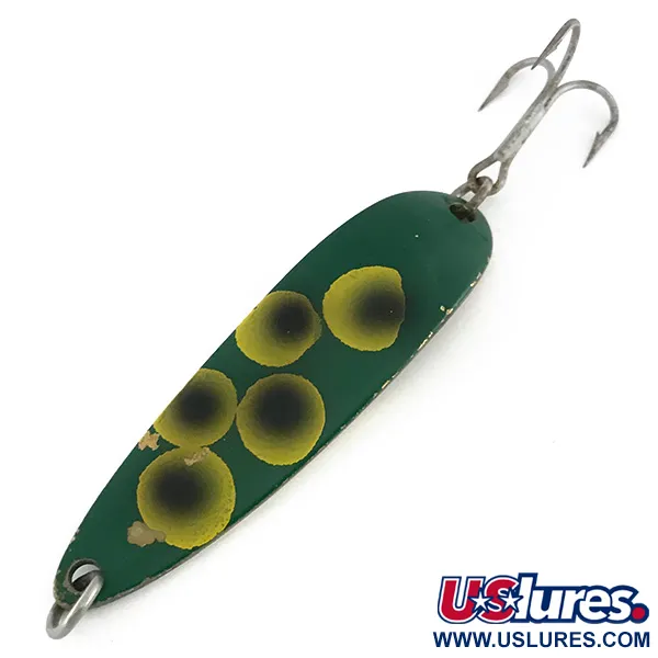 Une base en laiton poli confère un poids substantiel à cette cuillère ondulante pour le lancer et la traîne, fabriquée à Hood River, Oregon. Orné du motif classique « Frog » sur sa face avant, le leurre présente cinq points jaunes distincts avec des centres sombres sur une peinture vert forêt profond. Le revers révèle l'estampille claire du fabricant « LUHR JENSEN » et le nom « KROCODILE », ainsi que l'étiquette d'inventaire d'origine pour le code produit 8110. Pesant 1 oz (28 g), le corps en métal épais est conçu pour atteindre des distances inaccessibles aux cuillères plus légères. Sa longueur de 3 1/4" (8,5 cm) est associée à un hameçon triple robuste fixé par un anneau brisé solide, affichant une finition très bien conservée. Ce spécimen est noté 5/5 pour ses surfaces propres et ses lettrages nets. Le dessous en laiton offre un éclat naturel dans la colonne d'eau lorsqu'il est associé à la finition verte contrastée du dessus lors des récupérations à longue distance.