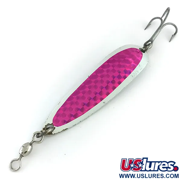 Mesurant une taille substantielle de 3 1/4 pouces (8,5 cm), cette cuillère ondulante en métal robuste présente une bande prismatique rose frappante superposée à un corps en chrome réfléchissant. Cette Luhr Jensen Krocodile Die #5, identifiée par le code produit 8508, pèse 1 oz (25 g), une catégorie de poids spécifiquement conçue pour aider les pêcheurs à atteindre les poissons postés en profondeur ou à effectuer des lancers à longue distance depuis les jetées. Le revers de la cuillère est clairement estampillé des marques historiques de la marque, « KROCODILE » et « LUHR JENSEN », ainsi que de son origine américaine. L'émerillon baril monté en tête et l'hameçon triple à l'arrière sont fixés par des anneaux brisés solides, maintenant l'intégrité requise pour les grands salmonidés. Le motif prismatique de ce spécimen offre un affichage lumineux facetté et multidirectionnel qui contraste avec le métal poli du périmètre de la cuillère. Ce leurre reste en excellent état, avec une note de 5/5. Le lettrage estampillé au dos est profond et lisible, un détail que les collectionneurs apprécient dans ces cuillères à lancer vintage.