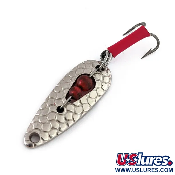 Frappé distinctement dans le métal argenté, le marquage « J. WALKER U.S.A. » confirme l'origine de ce leurre vintage. Mesurant 1 1/4" (3,4 cm), ce leurre compact présente une finition en nickel martelé distinctive conçue pour simuler les écailles naturelles des poissons. Deux perles rouges translucides sont logées dans la découpe centrale, apportant un élément visuel à fort contraste sur le corps réfléchissant. Pesant 1/8oz (4,4g), le KSM J-Walker est monté avec un hameçon triple gainé d'un tube en plastique rouge vif, qui sert de point d'attaque pour les carnassiers. Cet exemplaire du modèle 19800 est en excellent état, noté 5/5, avec toutes les surfaces métalliques et l'armement conservant leur lustre d'origine. Sa conception témoigne de l'approche utilitaire et efficace de la fabrication classique de matériel de pêche américain.