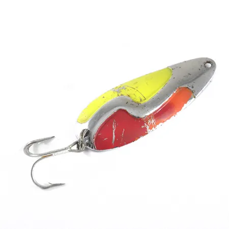 Des applications de peinture rouge, jaune et nickel caractérisent la face de cette cuillère Kush Spoon fabriquée aux USA, largement considérée comme l'ancêtre rare de l'Acme Kamlooper. Pesant 1/3 oz (9 g) et mesurant 2 1/4" (5,5 cm) de long, le corps métallique est frappé du nom de la marque « KUSH » et « USA » sur sa face intérieure. Sous le code produit 1743, ce spécimen présente des signes visibles de son état vintage, avec des manques de peinture et des marques de surface, pour une évaluation de l'état de 3/5. La forme présente une courbe en S classique associée à un hameçon triple attaché par un anneau brisé, reflétant les standards de fabrication de l'époque. Cette cuillère reste une pièce essentielle pour documenter la lignée des leurres métalliques américains.