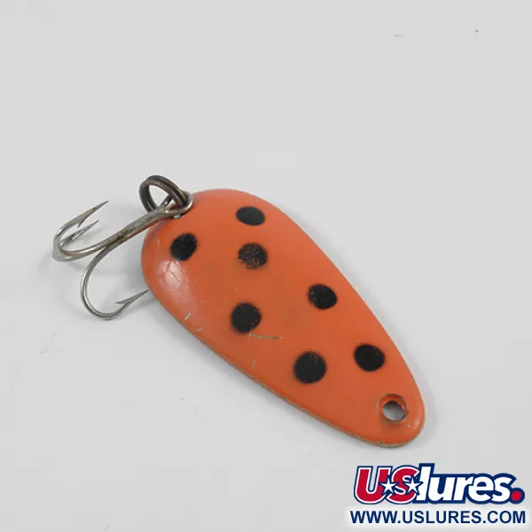 Ornée d'un motif audacieux de six points noirs sur une finition rouge orangé vibrante, cette cuillère de fabrication canadienne porte l'héritage d'un design qui est un incontournable des boîtes de pêche depuis 1929. Pesant 1/2 oz (14 g), son corps en laiton en forme de goutte d'eau mesure 2" (5,0 cm) de long, ce qui en fait un choix polyvalent pour le lancer comme pour la traîne. Le dos du leurre présente le poinçon classique profondément frappé du fabricant, l'identifiant comme un modèle Len Thompson #00. Sa peinture reste remarquablement nette et, avec une note d'état de 4/5, l'objet ne montre que de légers signes de manipulation tout en conservant une surface en laiton brillant et réfléchissant au revers. Il est équipé d'un anneau brisé robuste et d'un hameçon triple d'origine, destinés à tirer parti de la nage ondulante lente qui caractérise cette imitation de poisson fourrage. Les collectionneurs reconnaîtront l'accastillage et l'estampillage distincts associés au code produit 2579.