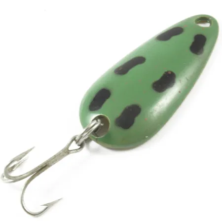 La marque « LEN THOMPSON No. 00 » est clairement estampillée sur le dessous en laiton, identifiant ce classique de fabrication canadienne. La face supérieure présente une base vert forêt mat décorée de sept points noirs distincts, un motif souvent utilisé pour imiter les amphibiens ou les poissons-fourrage. Mesurant 5 cm (2") et pesant 14 g (1/2 oz), cette cuillère est fabriquée en laiton massif, un choix de matériau utilisé par le fabricant depuis 1929 pour assurer un équilibre spécifique. Cette répartition du poids permet un mouvement d'oscillation lent lors de la récupération. L'armement se compose d'un unique hameçon triple fixé par un anneau brisé à l'arrière, tandis qu'un œillet d'attache se trouve au nez effilé. Répertorié sous le code produit 3217, ce spécimen est en condition 4/5, montrant une peinture bien conservée sur le dessus et une finition en laiton brillant et propre au revers. Le lancer ou la traîne avec cette cuillère est une méthode traditionnelle pour cibler le brochet, le saumon et le touladi.