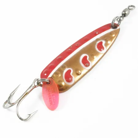 Le placage en cuivre avec des fossettes estampées au dos souligne le savoir-faire traditionnel de la fabrication canadienne de leurres. Pesant 25g (1oz) et mesurant 7cm (2 3/4"), ce Len Thompson #13 présente un motif distinctif de goutte d'eau rouge et blanc sur un corps en cuivre poli. Cet article spécifique, identifié par le code 3287, est en condition 5/5, affichant une finition brillante et une peinture bien conservée. L'armement comprend un triple robuste accompagné d'un teaser rose translucide et d'un émerillon baril haute résistance sur l'anneau brisé de tête. Sur la face concave intérieure, la marque du fabricant est clairement estampée dans le métal au milieu d'une surface texturée. Conçue pour la polyvalence, cette cuillère est fréquemment utilisée pour le lancer ou la traîne du brochet, du saumon et de la truite grise.