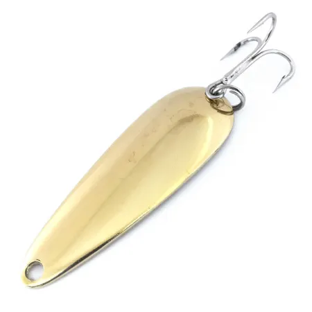 Mesurant 3 1/4" (8 cm) de long, cette cuillère en métal massif présente une finition or brillant qui produit un éclat métallique intense. Cette Len Thompson #2, répertoriée sous le code 10732, affiche un poids conséquent de 1 oz (28 g), ce qui la rend idéale pour atteindre les structures profondes lors du lancer ou de la traîne du brochet et du touladi. La face concave du leurre arbore l'estampille classique « LEN THOMPSON NO. 2 », véritable symbole de l'histoire manufacturière canadienne de la marque débutée en 1929. Son équilibre parfait génère une action de nage oscillante lente simulant un gros poisson fourrage. L'armement comprend un hameçon triple argenté piquant et un anneau brisé robuste, tous deux en excellent état. Ce spécimen est en condition 5/5, conservant une surface propre et hautement réfléchissante des deux côtés. Sa couleur dorée reste vibrante, offrant une visibilité optimale pour les carnassiers selon la clarté de l'eau.
