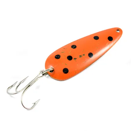 Mesurant 8 cm (3 1/4 pouces) de long, ce grand classique de fabrication canadienne se distingue par sa robe orange-rouge éclatante et son motif à points noirs bien marqué. Le poinçon « LEN THOMPSON NO 2 », clairement gravé au dos en laiton, désigne un leurre d'une grande polyvalence, aussi efficace à la traîne pour la truite grise qu'au lancer dans les zones peu profondes. Ce modèle de 28 g (1 oz) porte le code produit 2243 et illustre parfaitement l'attention portée par la marque à l'équilibre de nage. Présenté dans un état 4/5, il affiche de légères marques d'usage et de discrets éclats de peinture sur les bordures, témoins de son vécu dans une boîte à pêche. Dotée d'un hameçon triple argenté robuste, cette cuillère est conçue pour produire une oscillation lente imitant la nage d'un poisson fourrage blessé. L'anneau brisé demeure solide et opérationnel, prêt pour une nouvelle sortie ou pour intégrer une collection de passionnés.