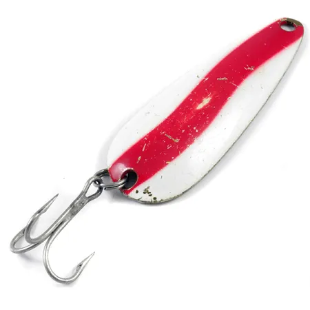 Arborant un motif diagonal rouge et blanc contrasté, cette cuillère de 28 g (1 oz) mesure 8 cm (3 1/4") et est conçue pour les pêches intensives en eau douce. Le revers porte l'estampille Little Cleo Wigl-Lure de la gamme Seneca, un design classique bien que répertorié sous le nom Len Thompson #2 dans la base de données sous le code 3239. L'état est évalué à 4/5, avec de petits éclats de peinture et des rayures visibles sur les bords de l'émail blanc et la partie centrale. Un hameçon triple robuste est fixé par un anneau brisé, complétant le corps épais en laiton conçu pour la stabilité dans la colonne d'eau. La courbure signature du métal produit une nage oscillante lente lors du lancer ou de la traîne.