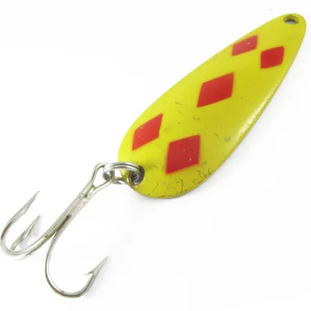 Cinq losanges rouges sont peints avec précision sur le fond jaune vif de ce classique fabriqué au Canada. Pesant 28 g (1 oz), cette cuillère ondulante (code produit 3681) présente le revers traditionnel aux tons de laiton que les collectionneurs recherchent sur les anciens modèles Len Thompson #2. Depuis la création de la marque en 1929, ces leurres ont été conçus pour imiter le profil d'un petit vairon, et ce spécimen de 8 cm (3 1/4") porte les inscriptions frappées distinctives sur son côté pile. Équipé d'un hameçon triple argenté, ce leurre est un incontournable pour le lancer ou la traîne du brochet et du touladi. Le motif de couleur Five of Diamonds est sans doute le plus célèbre du catalogue, destiné à offrir une grande visibilité dans diverses conditions d'eau. Évaluée à 4/5, la peinture jaune présente quelques rayures éparses et une légère usure due à l'usage, bien que l'intégrité structurelle du métal et de l'armement reste excellente. La cuillère est conçue pour une nage dandinante lente, un trait technique constant chez le fabricant depuis près d'un siècle.