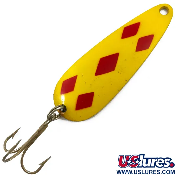 Cinq losanges rouges vifs sur un fini jaune éclatant marquent un design emblématique des boîtes à pêche depuis le début de la production en 1929. Pesant 28 g (1 oz), cette Len Thompson #2 (code produit 4653) possède une épaisseur qui favorise sa nage oscillante lente caractéristique lors de la récupération. Le revers de la cuillère comporte un estampage net identifiant la « LEN THOMPSON NO. 2 », laissant apparaître le métal de base couleur laiton. Avec une note d'état de 5/5, la peinture reste nette et l'armement, incluant l'hameçon triple d'origine, est parfaitement conservé. Ce spécimen de 8 cm témoigne de la réputation d'équilibre de la marque, constituant un choix fiable pour le lancer ou la traîne en eaux profondes où rôdent souvent saumons et truites steelhead.