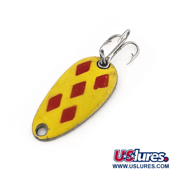 Un cadre compact de 1" (2,5 cm) arbore l'inimitable finition Five of Diamonds jaune et rouge sur ce classique canadien. Pesant 1/8oz (3,5g), le Len Thompson #6 est conçu avec l'équilibre qui définit la marque depuis 1929. Le revers présente la marque authentique du fabricant frappée directement dans le métal, identifiant le numéro du modèle et son héritage. Ce spécimen, associé au code produit 11269, conserve son éclat d'origine sur l'émail jaune et les cinq accents de losanges rouges. Les pêcheurs comptent souvent sur ces cuillères pour une action oscillante lente qui imite les petits poissons fourrages lors du lancer, de la traîne ou du jigging pour la truite et le brochet. L'armement se compose d'un hameçon triple robuste fixé par un anneau brisé. Chaque aspect de ce leurre reflète les normes de fabrication établies au Canada il y a près d'un siècle. L'état du spécimen est évalué à 5/5, la peinture et le métal restant très propres.
