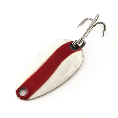 Le marquage 'LEN THOMPSON NO. 6' est clairement estampillé sur le revers de couleur laiton, identifiant l'origine de cette petite cuillère. Ce leurre fabriqué au Canada, portant le code produit 11312, présente une finition blanche classique accentuée par une large bande rouge diagonale sur sa face. Mesurant exactement 2,5 cm (1") de long et pesant 3,5 g (1/8 oz), la cuillère est construite sur une base en laiton massif. L'armement se compose d'un unique hameçon triple argenté fixé à l'extrémité large par un anneau brisé robuste. Classées en état 5/5, les surfaces en émail et en métal paraissent bien entretenues et propres. Historiquement, ces cuillères sont équilibrées pour une nage oscillante lente, une technique utilisée par les pêcheurs pour imiter les petits vairons ou poissons-fourrage depuis la création de la marque en 1929. Un trou d'attache est proprement percé à l'extrémité étroite de la cuillère.