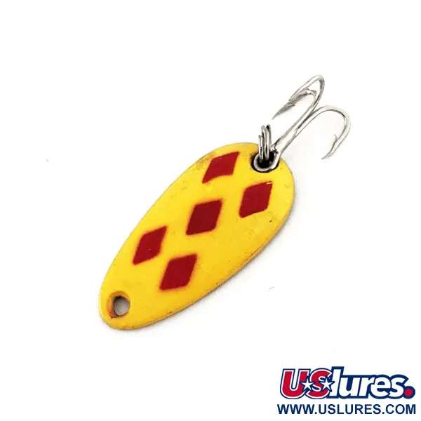 Directement frappées sur le revers de couleur laiton se trouvent les inscriptions « LEN THOMPSON NO. 6 », identifiant cette cuillère ondulante de fabrication canadienne. D'une longueur compacte de 2,5 cm (1") et d'un poids de 3,5 g (1/8 oz), elle arbore le motif Five of Diamonds très reconnaissable, composé de cinq losanges rouges imprimés sur une couche de base jaune. L'état de la cuillère est exceptionnel, montrant une finition bien conservée et un métal brillant à l'arrière, méritant une note de 5/5. Répertoriée sous le code produit 11369, cette cuillère est équipée d'un hameçon triple à finition argentée fixé par un anneau brisé, adapté au lancer ou à la traîne légère pour la truite et les petits poissons de sport. La forme en goutte d'eau et le laiton épais sont une marque de fabrique de Len Thompson depuis 1929, offrant une présentation équilibrée dans l'eau. La peinture sur le devant reste nette et vive, contrastant avec le dessous en laiton poli.