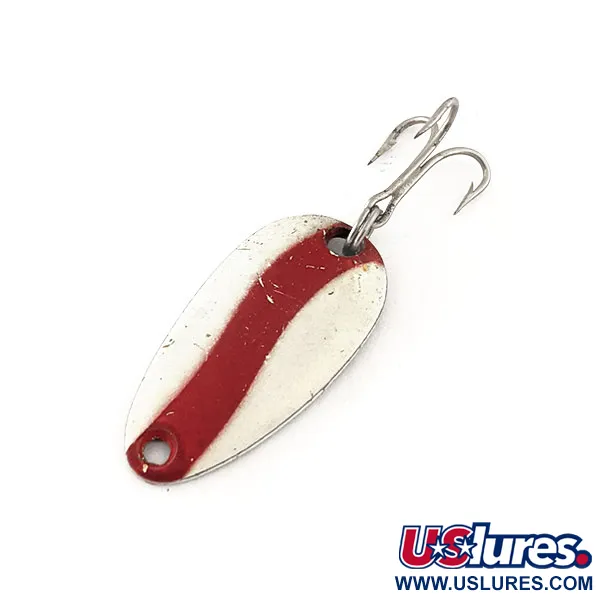 Une rayure rouge diagonale traverse la face blanc crème de cette cuillère compacte de 2,5 cm (1 pouce). Pesant 3,5 g (1/8 oz), cette pièce vintage porte le code produit 11497 et constitue un incontournable de la gamme Len Thompson. Le revers présente une finition en laiton avec un poinçon « NO. 0 », malgré sa désignation #6 dans le catalogue. Les pêcheurs comptent sur ces cuillères pour leur dandinement lent caractéristique au lancer ou à la traîne pour des espèces comme la truite et les petits percidés. Ce spécimen est en condition 5/5, montrant une légère usure de surface et de fines craquelures dans la peinture, ainsi qu'un certain ternissement et de l'oxydation sur le laiton et l'hameçon triple d'origine. Le profil en goutte d'eau est typique de Len Thompson, un design produit depuis 1929 pour imiter les petits poissons fourrage.