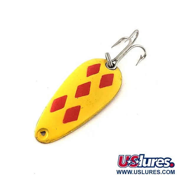 Cinq losanges rouges sont stencilés avec précision sur un émail jaune vif, créant le motif emblématique « Five of Diamonds » qui a rendu ces cuillères canadiennes célèbres depuis 1929. Ce spécimen est une Len Thompson #7, mesurant 3,4 cm (1 1/4") et pesant 5 g (3/16 oz). Le revers présente une finition en laiton brillant, marqué en profondeur par l'estampille du fabricant « LEN THOMPSON No.7 » pour signifier son héritage authentique. Conçue pour une variété de techniques, notamment le lancer et la traîne, le leurre est équipé d'un hameçon triple argenté fixé par un anneau brisé robuste. Enregistrée sous le code produit 11533, la cuillère est en état 5/5, conservant une surface lisse et une peinture à haut contraste. Le profil compact est spécifiquement lesté pour imiter la présence de petits poissons fourrage dans la colonne d'eau.