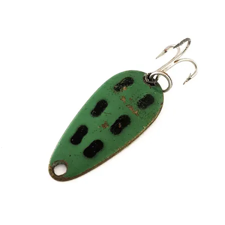 Dotée d'un motif Grenouille vibrant, cette cuillère canadienne de 3,5 cm (1 1/2") présente une face supérieure vert herbe avec des taches ovales noires distinctives. Le dessous aux tons laiton porte l'inscription frappée « LEN THOMPSON NO 7 », témoignant de l'héritage d'un fabricant incontournable depuis 1929. Avec un poids de 5 g (3/16 oz), cette ondulante est conçue pour une nage lente et chaloupée imitant un petit poisson fourrage. L'hameçon triple argenté est fixé par un anneau brisé fiable, et l'état général est de 4/5, montrant quelques légers signes d'utilisation. Référencée sous le code 11545, sa forme en goutte d'eau et sa base en laiton sont des traits classiques de la gamme Len Thompson.