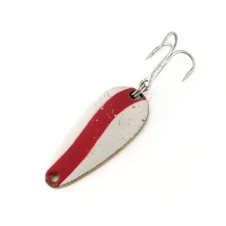 L'estampillage 'LEN THOMPSON No. 7' au dos en laiton identifie cette cuillère comme un classique de fabrication canadienne d'un fabricant actif depuis 1929. Une bande rouge audacieuse en forme de vague traverse la face peinte en blanc, créant un motif contrasté conçu pour attirer l'œil des prédateurs tels que le brochet ou le touladi. Mesurant exactement 3,5 cm (1 1/2 pouce), son profil en forme de larme est familier dans les boîtes à pêche des vétérans. Avec un poids de 5 g (3/16 oz), elle offre d'excellentes sensations pour le lancer ou la traîne légère dans diverses conditions. La peinture blanche présente quelques légers éclats et éraflures dus à l'âge, ce qui lui vaut une note de condition de 5/5. Réputé pour son action de nage lente et oscillante, ce modèle No. 7 est un choix fiable pour les poissons difficiles. Le leurre est armé d'un hameçon triple argenté robuste et est répertorié sous le code 11642.
