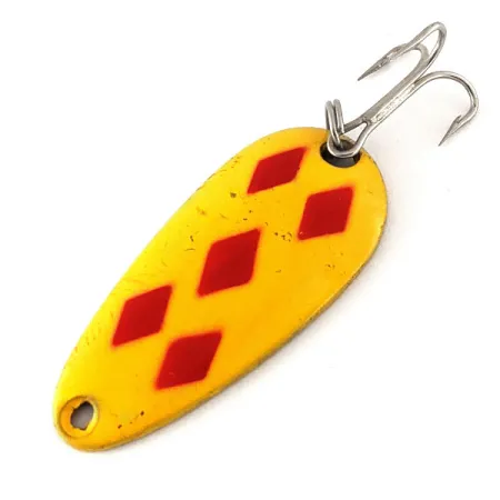 Cinq losanges rouges distinctifs ressortent sur l'émail jaune vif de ce leurre canadien. Mesurant 4 cm (1 1/2") et pesant 7 g (1/4 oz), la taille #8 est un incontournable pour les pêcheurs ciblant diverses espèces d'eau douce au lancer ou à la traîne. Le revers révèle une finition en laiton propre avec l'estampille « LEN THOMPSON NO. 8 » bien visible, marque de fabrique d'un héritage manufacturier débuté en 1929. Identifié par le code produit 12340, ce spécimen est en état 5/5, conservant une surface lisse et des lignes de peinture nettes. Cette cuillère est montée avec un hameçon triple de couleur argentée et un anneau brisé. Ces cuillères en laiton sont historiquement reconnues pour leur action de nage vacillante et lente. L'œillet avant est propre, permettant une connexion facile à une agrafe ou au corps de ligne.