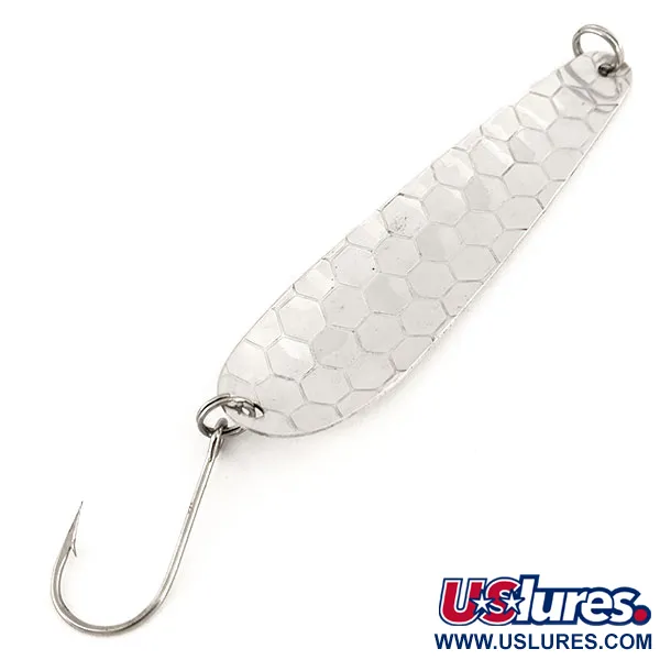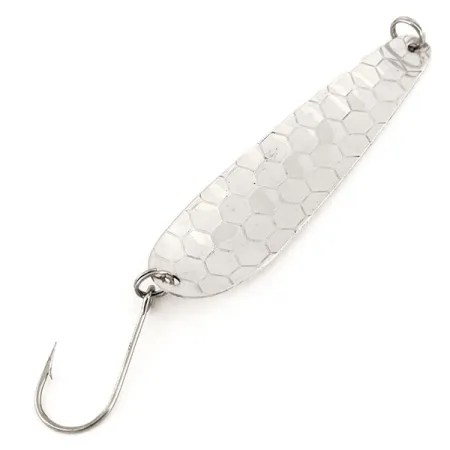 Un motif hexagonal martelé classique recouvre la surface de cette cuillère en laiton plaqué argent, un design conçu pour maximiser la réflexion de la lumière pour la traîne en eau profonde. Pesant 14 g (1/2 oz) et mesurant 9,5 cm (3 3/4"), cette Len Thompson Northern King NK28 est un spécimen bien conservé identifié par le code 12691. Le leurre est en état 5/5, affichant la finition brillante et propre caractéristique du véritable placage d'argent utilisé par ce fabricant canadien depuis le lancement de la série en 1984. Ce modèle spécifique est reconnu par les pêcheurs pour son action de dandinage lente, particulièrement efficace pour cibler le touladi, le saumon et la truite steelhead. Sur la face concave intérieure près de la queue, le marquage « NK 28 » reste net et parfaitement lisible. L'armement se compose d'un unique grand hameçon fixé par un anneau brisé robuste, avec un point d'attache correspondant à la tête pour votre ligne ou un émerillon.