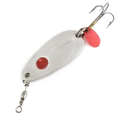 Dotée d'un placage en nickel brillant, cette cuillère de 4 cm (1 1/2") présente un point rouge distinctif peint sur sa face convexe. D'un poids de 7 g (1/4 oz), ce modèle est estampillé au dos « Les Davis 1/4 OZ. HOTROD », confirmant son origine américaine (USA). Elle porte le code produit 21929 et est équipée d'un hameçon triple standard ainsi que d'une petite languette attractive en plastique rouge sur l'anneau brisé arrière. Un émerillon baril est fixé à l'avant pour assurer une rotation fluide lors du lancer ou de la traîne. Cet exemplaire est en excellent état (note de 5/5), la finition nickel et les accents rouges étant parfaitement préservés. Sa forme en goutte d'eau est un classique du matériel de pêche américain du milieu du siècle, conçue pour une visibilité optimale dans diverses conditions de luminosité.