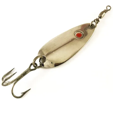 Le placage en nickel offre une finition classique et très brillante à cette cuillère de 3,5 cm (1 1/2"), qui reste l'une des préférées des collectionneurs de l'histoire du matériel de pêche de la côte Ouest. Au dos, sur la face concave, le nom 'Les Davis Hotrod' est clairement frappé à côté d'un marquage de 1/6 oz, même si le poids standard du catalogue pour ce code produit 3605 est de 3/16 oz (5 g). Un point rouge centré sur la face avant polie, près de l'attache de ligne, offre un signal visuel simple mais efficace contre le corps métallique. Ce spécimen fabriqué aux États-Unis est dans un état 5/5, présentant une surface brillante et un émerillon à ligature métallique parfaitement intact. L'hameçon triple d'origine est fixé via un anneau brisé robuste et ne montre aucun signe d'utilisation ou d'usure, reflétant l'excellent état de conservation depuis sa production avant la transition de la marque sous Luhr Jensen.