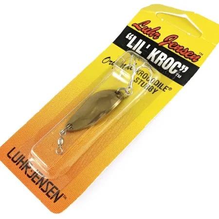 Avec sa finition Or poli éclatante, cette cuillère compacte pèse 4,5 g (3/16 oz) et mesure 3,2 cm (1 1/4 pouce) de long. Produite par Luhr Jensen, la Lil' Kroc (Krocodile Stubby) offre un profil plus court et plus dense que les leurres Krocodile standards pour répondre à des besoins de lancer spécifiques. Cet exemplaire porte le code produit 1123-018-0002 (réf. interne 17153) et est présenté dans son emballage vintage d'origine de l'époque de Hood River, Oregon. Son corps en laiton massif est équipé d'un émerillon baril monté à l'avant pour limiter le vrillage du fil et d'un hameçon triple piquant à l'arrière fixé par un anneau brisé. Ce leurre n'a jamais été utilisé et reste dans son blister de vente d'origine. Le dos du carton présente une offre de catalogue multilingue et un tampon de date de production au 21 octobre 1997.