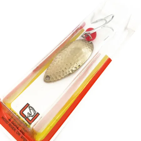 Le nickel martelé crée une surface réfléchissant la lumière sur cette Lil' Kroc, une variante moins courante de la légendaire série Krocodile de Luhr Jensen. Identifié par le marquage « Krocodile Stubby » sur la face concave, ce leurre présente un profil plus court et plus épais que les cuillères standards, lui permettant d'atteindre efficacement la profondeur lors du lancer ou de la traîne. Pesant 1/2 oz (14 g) et mesurant 2 1/4" (5,5 cm), il est doté d'un équipement durable comprenant un anneau brisé renforcé et un hameçon triple associé à une palette rouge classique. Ce spécimen spécifique, répertorié sous le code produit 9806, n'a jamais été utilisé, bien que l'emballage d'origine présente une certaine usure due au stockage. La construction en métal épais offre une masse importante pour sa taille, une caractéristique destinée à la distance et à la stabilité. Chaque marquage sur la face interne reste clair et lisible, témoignant de l'héritage de Hood River, Oregon, de cette pièce vintage.