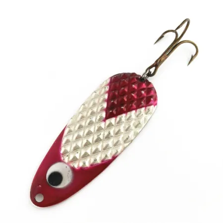 Le placage nickelé à texture diamantée sert de base à cette cuillère Lindy Gator de 2 oz (55 g). Mesurant 11,5 cm (4 1/2 po) de long, le leurre présente une finition peinte rouge et blanc sur un motif d'écailles estampé. Un chevron rouge vif accentue la zone de la tête, tandis que le reste du corps passe à un centre blanc avec du rouge sur les bords inférieurs. Fabriqué aux États-Unis par Lindy / Little Joe, ce modèle porte le code produit 23586 et inclut un œil mobile surdimensionné pour un contraste visuel accru près de l'attache. L'armement se compose d'un hameçon triple robuste fixé par un anneau brisé à l'arrière. Affichant un état évalué à 4/5, la cuillère présente des surfaces métalliques brillantes et des pigments vifs sur l'ensemble de sa structure.
