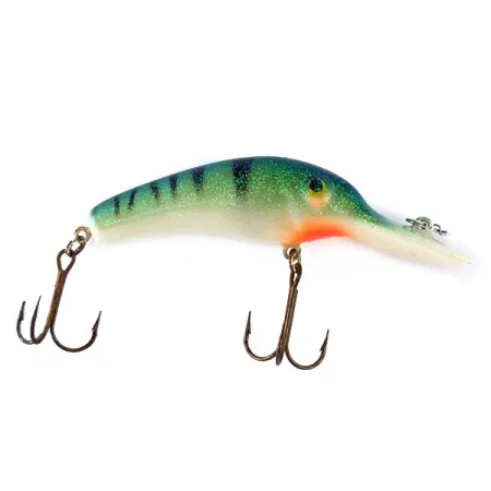 Pesant exactement 1/4 oz (7 g), ce Lindy Shadling est un exemple emblématique du savoir-faire américain des années 1980 de Lindy / Little Joe. Son corps de 5 cm (2") arbore un motif Perche riche, mêlant un dos vert pailleté à des rayures verticales marquées sur un ventre de couleur crème. Sous le menton, une tache orange vif offre un point de contraste classique pour inciter les poissons suiveurs à l'attaque. Ce modèle spécifique, identifié par le code produit 11104, est dans un état irréprochable (5/5), conservant son éclat d'origine tant sur la peinture que sur l'armement. La longue bavette intégrée caractérise la conception du Shadling, devenu un incontournable pour les pêcheurs ciblant les espèces de profondeur. Les collectionneurs apprécieront la préservation de la finition pailletée, qui était une signature esthétique des leurres Lindy de cette époque.