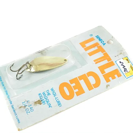 Le placage or offre une finition intemporelle à cette cuillère ondulante de 7g (1/4 oz), une catégorie de poids éprouvée depuis des décennies en eau douce comme en mer. Mesurant 4 cm (1 1/2"), cette Seneca Little Cleo porte le code produit 2882 et représente une époque charnière de l'histoire du matériel de pêche avant l'acquisition de la marque par Acme au début des années 1980. Cet exemplaire est particulièrement remarquable pour son estampillage Hula Girl sur la face concave, un détail qui, selon de nombreux pêcheurs chevronnés, a contribué au statut légendaire du leurre avant que le design ne soit simplifié. Le leurre est présenté à l'état neuf, avec une note de 6, et reste scellé dans son blister vintage d'origine. Le dos du carton souligne l'emplacement de la division Seneca à Providence, RI, et fournit des instructions de pêche spécifiques pour le lancer ou la traîne sur des espèces cibles telles que la truite, le saumon et le brochet maillé. L'armement comprend un hameçon triple d'origine, ne présentant aucun signe d'âge ou d'usure.