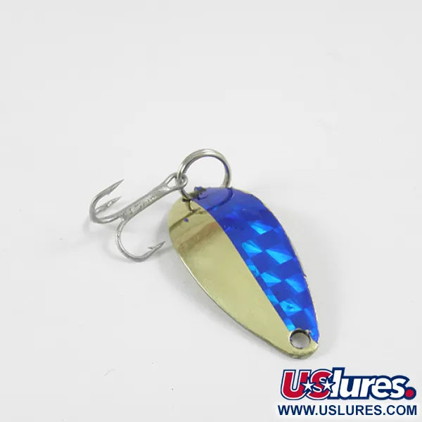 Mesurant 3 cm (1 1/4"), cette cuiller Seneca présente une finition bicolore frappante sur sa face convexe. Une moitié conserve un éclat brillant plaqué or, tandis que l'autre est recouverte d'un ruban prismatique à écailles bleu vif qui capte la lumière avec efficacité. Ce modèle spécifique, code produit 2972, représente l'ère originale Seneca du design avant que la marque ne soit acquise par Acme. Le dos du leurre est frappé du nom « LITTLE CLEO », conservant des lignes nettes et un lettrage clair. Avec un poids de 3,5 g (1/8 oz), la cuiller est dimensionnée pour des lancers de précision sur du matériel léger. L'armement se compose d'un anneau brisé robuste et d'un hameçon triple brillant. En condition 5/5, la finition reste exceptionnellement propre sur le placage or et le détail du prisme bleu.