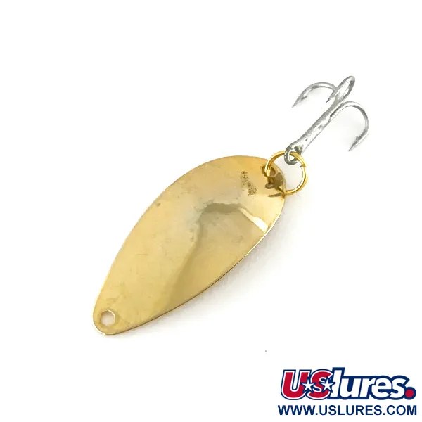 Une finition dorée polie recouvre l'intégralité de cette cuillère ondulante en métal de 3 cm (1 1/4"), reflétant l'héritage original de la Seneca Lure Co. des États-Unis. Pesant seulement 1,8 g (1/16 oz), cette version de la Little Cleo présente le profil plus fin de type traîne produit avant le rachat de la marque par Acme au début des années 1980. La surface métallique comporte un marquage net "LITTLE CLEO" à l'arrière, accompagné du nom Seneca, ce qui permet aux collectionneurs d'identifier son époque de fabrication. Un hameçon triple tranchant à finition argentée est fixé à la queue via un anneau brisé doré. Ce spécimen, répertorié sous le code produit 8180, conserve une note de condition de 5/5 avec une surface brillante et réfléchissante sans aucun signe d'usure visible. La forme en goutte d'eau et la légère courbure sont caractéristiques de ce design destiné au lancer léger ou à la traîne.