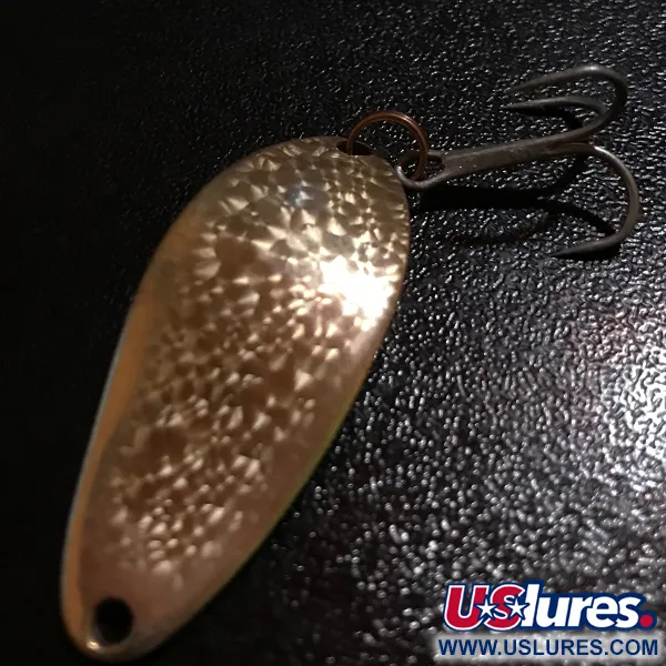 Les surfaces facettées du corps doré martelé distinguent cette Little Cleo Crystal de l'ère Seneca, un témoin de l'histoire du matériel de pêche américain produit avant le rachat par Acme au début des années 1980. Pesant 1/4 oz (7 g), la cuillère mesure 1 1/2" (4 cm) et porte l'estampille "LITTLE CLEO WIGL-LURE A SENECA LURE" bien visible sur sa face concave. La désignation de couleur Crystal fait référence à la texture multi-angulaire spécifique conçue pour capter la lumière, associée à un anneau brisé classique de couleur cuivre et à un hameçon triple d'origine piquant. Fabriqué aux USA, ce spécimen porte le code produit 8326 et est conservé dans un état 5/5. Son profil incurvé et épais reflète l'ingénierie originale de Seneca destinée au lancer et à la traîne, représentant une époque spécifique de la production de leurres avant la transition de la marque vers Acme.