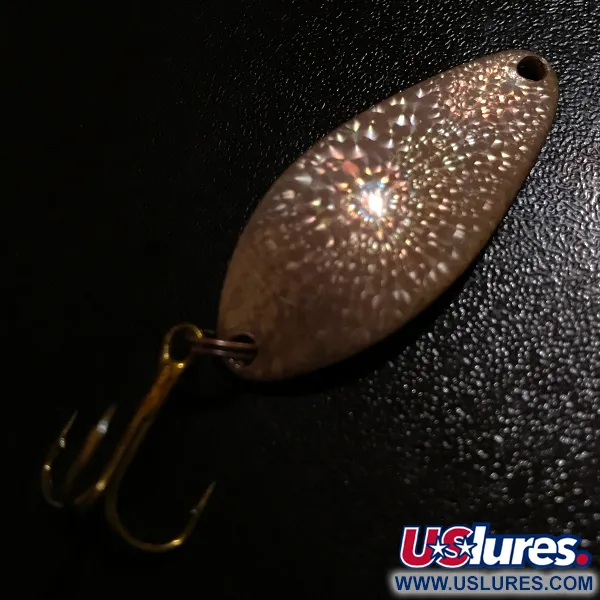 Estampillée de l'emblématique logo « Little Cleo » sur son revers, cette cuillère de 4 cm (1 1/2") présente la rare finition Crystal (Golden Scale), un motif texturé conçu pour capturer et diffuser la lumière. Pesant 7 g (1/4 oz), ce spécimen représente le savoir-faire de l'originale Seneca Lure Co. basée aux USA, fabriquée avant le rachat de la marque par Acme au début des années 1980. L'effet « verre brisé » à l'avant du leurre, identifié par le code produit 8399, reste remarquablement clair et réfléchissant. L'armement se compose d'un anneau brisé supérieur robuste et d'un hameçon triple piquant à finition bronze. Ce leurre particulier est en état 5/5, affichant des surfaces bien conservées et un estampage net. La forme large et bombée de la cuillère est une caractéristique phare du design Little Cleo, fréquemment utilisée pour le lancer et la traîne.