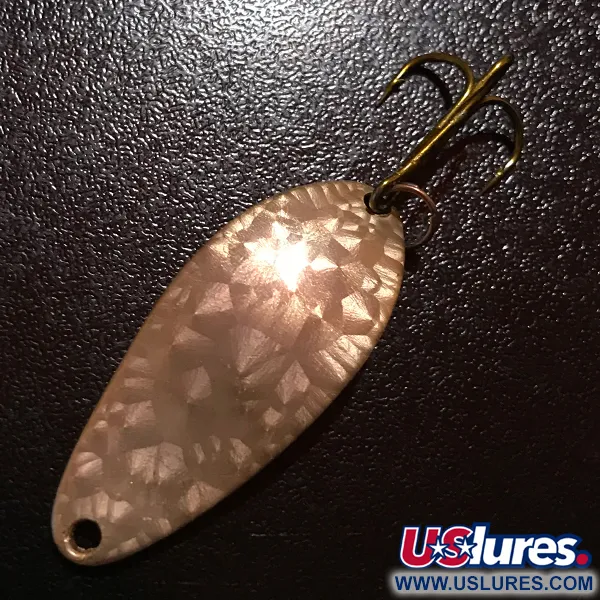 Estampillée du marquage distinctif « Little Cleo Wigg-Lure A Seneca Lure » sur sa face concave, cette cuillère est une pièce authentique de l'histoire du matériel de pêche américain datant d'avant le rachat de Seneca par Acme au début des années 1980. La rare finition Crystal, également connue sous le nom de Golden Scale, présente une texture multidimensionnelle rappelant le verre brisé, conçue pour capter la lumière sous tous les angles. Pesant 1/4oz (7g) pour une longueur de 1 1/2" (4cm), cet exemplaire est dans un état 5/5, affichant des surfaces remarquablement propres et un armement bien conservé. L'hameçon triple vintage est solidement fixé via un anneau brisé, complétant la forme classique en goutte d'eau du code produit 8430. Originaire des USA, la face avant martelée du leurre produit un éclat contrasté qui distinguait la production originale de Seneca des versions ultérieures.