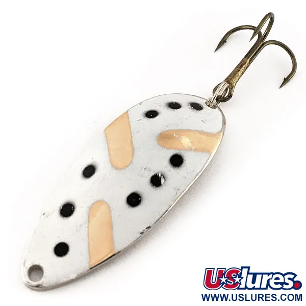 Des rayures métalliques dorées transparaissent à travers une finition peinte en blanc sur cette cuillère de 5,5 cm (2 1/4"), accentuée par des points noirs distincts. Pesant 18 g (2/3 oz), cette Little Cleo (Hula Girl) fabriquée par Seneca est un leurre à lancer robuste répertorié sous le code produit 12219. En retournant la cuillère, on découvre le détail le plus recherché par les amateurs de vintage : l'estampille nette de la silhouette dansante aux côtés de la marque « WIGL LURE ». Ce spécimen particulier fabriqué aux USA remonte à l'époque précédant le rachat de Seneca par Acme au début des années 1980, une période où la danseuse était un élément standard du design. De nombreux pêcheurs chevronnés ne jurent que par les versions originales de Seneca pour leur construction spécifique et leur répartition du poids. L'état est excellent, noté 5/5, avec le dos métallique reflétant une finition propre et brillante. Elle est équipée d'un hameçon triple robuste fixé par un anneau brisé, conçu pour les lancers à longue distance en eaux profondes.