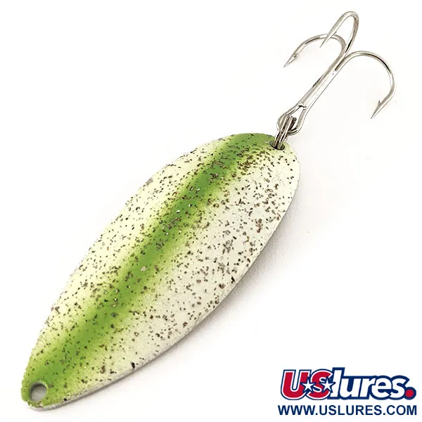 Une bande verte éclatante divise la face blanche de cette cuillère de 21 g (3/4 oz), laquelle est en outre décorée d'un généreux saupoudrage de paillettes sombres. Mesurant 6,5 cm (2 1/2"), ce modèle spécifique, code produit 12267, remonte à l'époque où Seneca Lure frappait encore la danseuse « Hula Girl » au verso. Le dos en finition nickel affiche clairement les marquages « WIGL LURE » et « LITTLE CLEO », des détails qui identifient sa fabrication antérieure aux années 1980, avant qu'Acme ne supprime le graphisme de la danseuse. L'exemplaire est dans un état 5/5, préservant la netteté de l'estampillage et l'intégrité de la peinture. Un anneau brisé robuste relie l'hameçon triple d'origine à la queue, tandis que l'œillet de tête reste propre et circulaire. Ce modèle représente le design classique des cuillères à lancer américaines, lesté pour la distance et la durabilité.