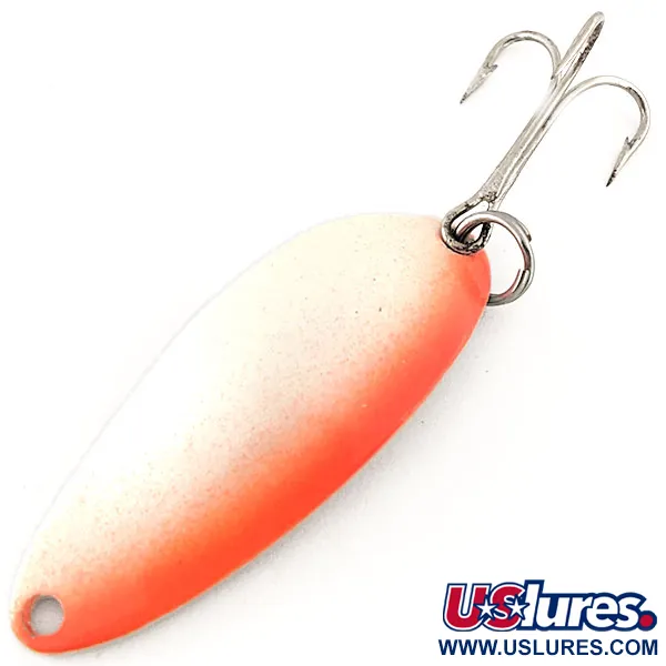 Pesant 10 g (1/3 oz), cette Little Cleo originale produite par Seneca présente l'estampille classique "Hula Girl" sur son revers, un détail prisé des collectionneurs depuis qu'Acme a supprimé l'icône de la danseuse après avoir racheté la marque au début des années 1980. Le corps de la cuiller ondulante de 4,5 cm (1 3/4") arbore un dégradé orange et blanc vibrant qui assure une transition fluide sur sa surface convexe. Identifiés par le code produit 12979, ces premiers modèles Seneca ont établi l'héritage qui, selon de nombreux pêcheurs chevronnés, est à l'origine de la réputation du leurre. L'armement est exceptionnellement bien conservé, avec un anneau brisé robuste et un hameçon triple piquant à l'état neuf, noté 5/5. En regardant de près le dos nickelé, les marquages nets "Wig-L-Lure" et "Little Cleo" aux côtés de la silhouette de la danseuse identifient cet exemplaire comme un authentique produit fabriqué aux USA de l'ère pré-Acme.