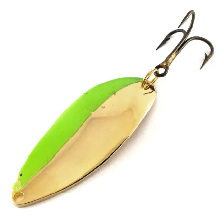 Frappée du poids de 21 g (3/4 oz) sur sa face concave dorée et polie, cette cuillère ondulante témoigne d'une époque spécifique de la fabrication de matériel de pêche américain. Le corps de 6,5 cm (2 1/2") arbore la légendaire gravure de la danseuse « Hula Girl », un détail identifiant la production originale de Seneca avant le rachat par Acme au début des années 1980. Ce modèle, identifié par le code produit 13241, présente une finition bicolore frappante combinant un côté vert fluorescent haute visibilité et une moitié dorée réfléchissante. L'armement comprend un anneau brisé robuste de couleur dorée et un hameçon triple à finition sombre en bon état. Les collectionneurs recherchent spécifiquement ces exemplaires de l'ère Seneca pour la présence du logo de la danseuse, que de nombreux pêcheurs chevronnés considèrent comme un facteur clé du succès historique de ce leurre. La surface montre de légers signes de manipulation liés à son âge, justifiant une note d'état de 4/5. Les inscriptions profondément marquées et l'emblématique silhouette de danseuse près de la queue restent nettes et bien définies.