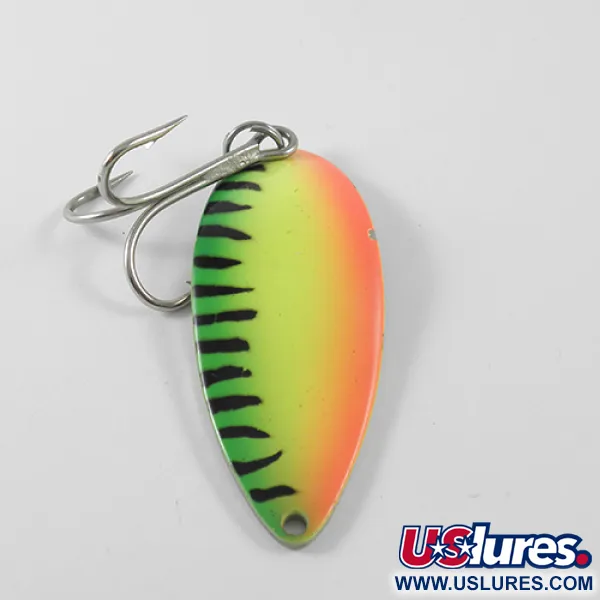 Des teintes vertes et orangées se fondant dans un jaune éclatant dominent la finition Fire Tiger de cette cuillère ondulante de 21 g (3/4 oz). Mesurant 6,5 cm (2 1/2"), cet exemplaire provient de la société Seneca Lure, fabriqué avant que la marque ne soit rachetée par Acme au début des années 1980. En retournant le leurre, vous trouverez l'emblématique danseuse « Hula Girl » frappée sur l'envers nickelé, une caractéristique qui a disparu des versions modernes et reste un détail prisé des collectionneurs vintage. De nombreux pêcheurs chevronnés soutiennent que ce design spécifique marqué de la danseuse était le secret du succès historique de ce leurre. Le motif frontal est accentué par de nettes barres verticales noires qui brisent le profil fluorescent. Ce leurre, répertorié sous le code produit 1454, présente une finition et un armement bien conservés, avec une note d'état de 4/5. Il est équipé de l'hameçon triple renforcé d'origine fixé par un anneau brisé robuste, reflétant sa fabrication américaine.