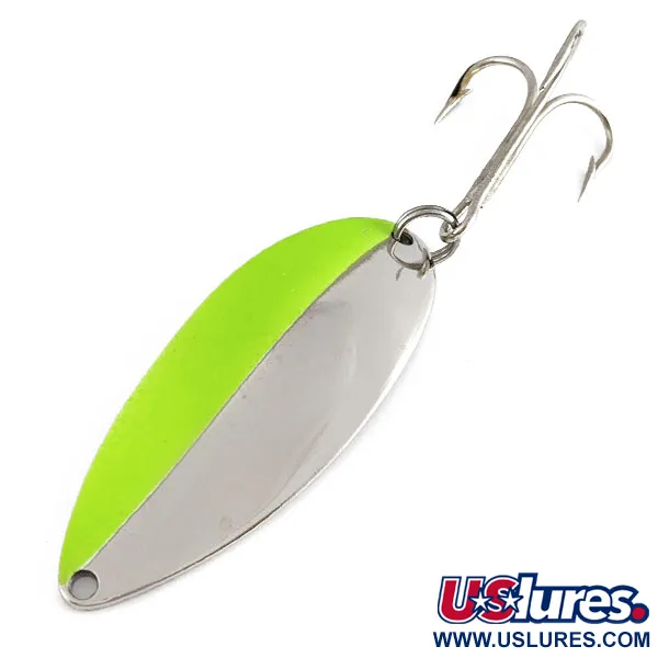 Affichant un poids conséquent de 21 g (3/4 oz), cette cuillère ondulante robuste présente une finition bicolore nickel et vert fluo saisissante. Mesurant 6,5 cm (2 1/2"), le leurre arbore l'emblématique danseuse « Hula Girl » frappée dans le nickel sur sa face concave — un détail signature de l'époque Seneca Lure Company. De nombreux pêcheurs expérimentés ne jurent que par cette version spécifique « dancer », antérieure au rachat par Acme au début des années 1980, époque où la gravure a fini par être abandonnée. Cet exemplaire, identifié par le code produit 21764, est dans un état exceptionnel, avec une note de 5/5 pour l'éclat de ses surfaces et son armement d'origine. Ce classique fabriqué aux États-Unis possède le poids nécessaire pour de longs lancers en eaux profondes, là où les éclats du nickel sont les plus efficaces.
