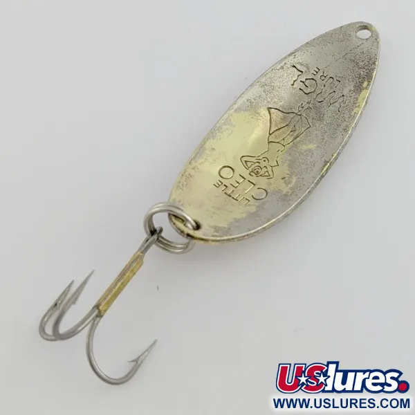 L'estampage de l'emblématique figurine « Hula Girl » au verso identifie immédiatement cette cuillère ondulante de 14 g (1/2 oz) comme une Little Cleo classique de l'ère originale Seneca. Mesurant 5,5 cm (2 1/4"), ce spécimen présente une finition bicolore nickel et laiton qui affiche le caractère authentique d'une boîte de pêche bien utilisée, lui valant une note de condition de 3/5. Avant son rachat par Acme Tackle au début des années 1980, la Seneca Tackle Company de New York produisait ces leurres avec la gravure détaillée d'une danseuse — un ajout inspiré par une danseuse exotique vue par l'auteur-compositeur C.V. « Charlie » Clark dans les années 1930. De nombreux pêcheurs chevronnés jurent encore que la présence du logo de la danseuse est un porte-bonheur pour la truite et le saumon des Grands Lacs. Ce leurre spécifique, identifié par le code produit 24443, porte l'armature classique de forte section et un hameçon triple sécurisé par un anneau brisé robuste. Le laiton de base transparaît sous le placage nickel sur le côté convexe, offrant un contraste visuel distinct qui diffère des rééditions modernes.