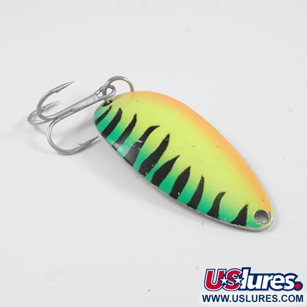 Des teintes vives Fire Tiger de jaune, vert et orange recouvrent la face convexe de cette cuillère ondulante de 14 g (1/2 oz). Portant le code produit 2540, le dos en argent poli présente l'emblématique marquage de la danseuse « Hula Girl » qui a défini la production originale de la société Seneca Lure. Mesurant 5,5 cm (2 1/4"), le corps métallique conserve sa finition brillante et son marquage net. Les collectionneurs recherchent souvent cette version spécifique car le logo de la danseuse a été abandonné après le rachat de la marque par Acme au début des années 1980. L'armement se compose d'un anneau brisé robuste et d'un hameçon triple propre. Ne montrant aucun signe d'usure, l'état de cet exemplaire est noté 5/5. Les détails estampillés au verso indiquent son origine authentique des États-Unis, préservant une part de l'histoire de la pêche de l'époque où ces leurres sont devenus légendaires pour le lancer et la traîne.