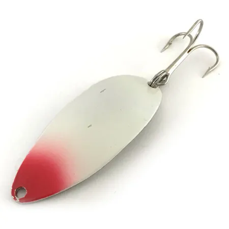 Pesant 1/2 oz (14 g), cette authentique cuillère Seneca Little Cleo (Hula Girl) arbore l'image emblématique frappée de la danseuse sur son revers nickelé. Ce spécimen spécifique, répertorié sous le code produit 8715, présente une finition blanc perle accentuée par un nez rouge vif sur le devant. Mesurant 2 1/4" (5,5 cm), ce leurre représente l'ère de production originale de la société Seneca Lure basée aux USA, avant le rachat de la marque par Acme au début des années 1980. Les collectionneurs recherchent fréquemment ces versions vintage car la gravure signature Hula Girl a finalement été supprimée des versions modernes. Sa structure se compose d'un corps en métal de forte épaisseur équipé d'un anneau brisé robuste et d'un hameçon triple argenté. Les surfaces sont remarquablement propres, lui valant une note de condition de 5/5 pour sa peinture bien conservée et son fini nickel brillant.