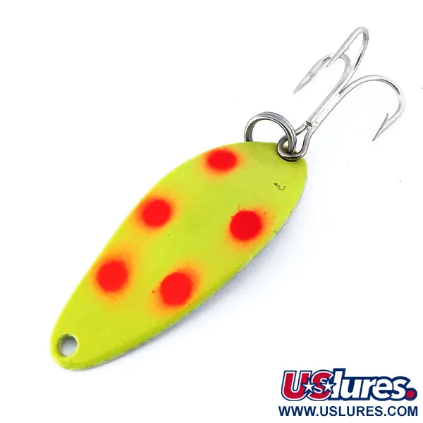 Pesant 7 g (1/4 oz), cette cuillère vintage présente un motif de couleur distinctif composé de cinq points rouges sur une face jaune néon. Cette Little Cleo UV, portant le code produit 10707, a été fabriquée aux États-Unis par Seneca Lure avant que la marque ne soit rachetée par Acme au début des années 1980. Le corps métallique de 4 cm (1 1/2") possède un dos en nickel poli, tandis que l'avant présente un revêtement réactif aux UV qui brille en vert vif dans des conditions de faible luminosité. Classé 6, ce leurre est à l'état neuf, conservant sa finition et ses composants d'origine. L'hameçon triple reste piquant et est solidement fixé par l'anneau brisé d'origine.