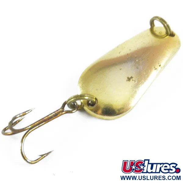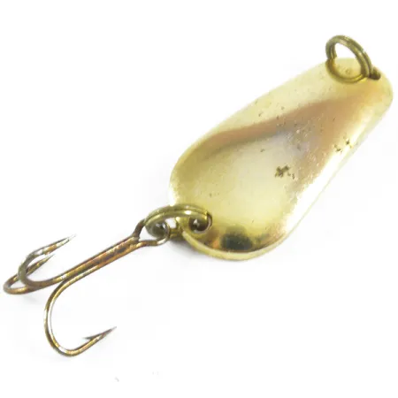 Mesurant exactement 3,5 cm (1 1/2"), le profil en forme de goutte de cette cuillère ondulante en métal Sensation est conçu pour des applications polyvalentes de lancer ou de traîne. Estampé sur la face concave du leurre, le nom « LITTLE DEMON » identifie ses origines en tant qu'article de pêche fabriqué aux USA. Un poids de 8 g (1/4 oz) permet un contrôle précis sur un matériel léger à moyen. La finition dorée conserve ses qualités réfléchissantes, ne montrant que de légers signes d'usure de surface qui justifient une note d'état de 4/5. Des anneaux brisés de style original relient l'attache de ligne et l'hameçon triple, qui reste intact avec une légère décoloration sur le métal. Répertorié sous le code produit 3508, ce spécimen est un exemple propre de la conception de leurres métalliques du milieu du siècle.