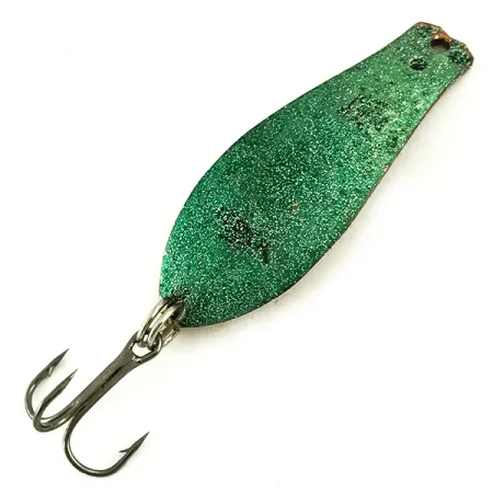 Des paillettes vertes recouvrent l'avant de cette cuillère de 7g (1/4oz), offrant une surface texturée hautement réfléchissante qui capte la lumière sous différents angles. Fabriquée aux États-Unis par Prescott Spinner, cette Little Doctor 255 (Code 5656) présente une finition contrastée de paillettes dorées sur son revers. Sa forme en goutte d'eau mesure 4,7 cm (1 3/4"), une taille polyvalente pour de nombreuses espèces d'eau douce. L'identification estampée à l'avant reste nette et lisible sur la finition scintillante. Équipée d'un anneau brisé robuste et d'un hameçon triple à finition sombre, l'armature est parfaitement conservée. Ce spécimen est en excellent état, avec une note de 5/5. Le corps métallique légèrement incurvé est destiné au lancer ou à la traîne, là où une présentation à fort éclat est nécessaire. L'application bicolore de paillettes est une signature classique de Prescott Spinner, offrant un profil visuel distinct par rapport aux leurres en métal poli standard.